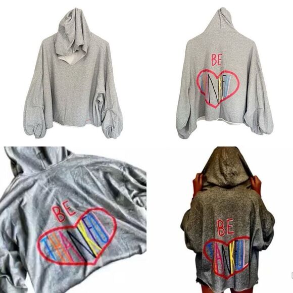 Hand painted, one of a kind oversized hoodie sweatshirt by Wren + Glory NYC. Gray oversized crop hoodie with balloon sleeves and raw hem. Faux drawstring holes on hood. Be Thankful in multicolors and a heart on the back. @wrenandglory on the bottom left front. Approximately 23” long and 28” armpit to armpit.