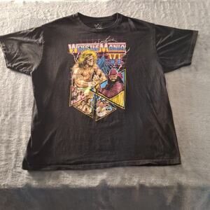 The WrestleMania VI Ultimate Warrior Macho Man Randy Savage T-Shirt in size 2XL is an officially licensed product by WWE featuring iconic wrestler Randy Savage. This black shirt is a must-have for fans of wrestling and showcases a classic design that pays homage to the WWF era. Perfect for men who appreciate the legendary wrestlers of the past, this shirt is a stylish and comfortable way to show support for your favorite wrestling superstars. Please see photos for condition.