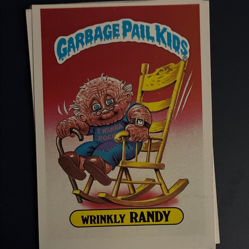 Collect the iconic Wrinkly Randy trading card. Featuring vibrant red and yellow colors, this card is a must-have for fans and collectors.