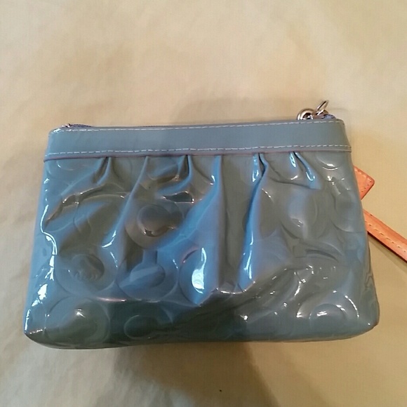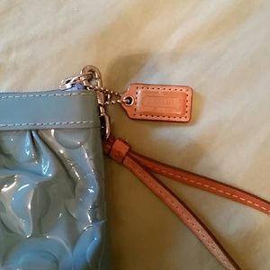 Light blue leather wristlet with coach "C's" on it