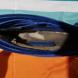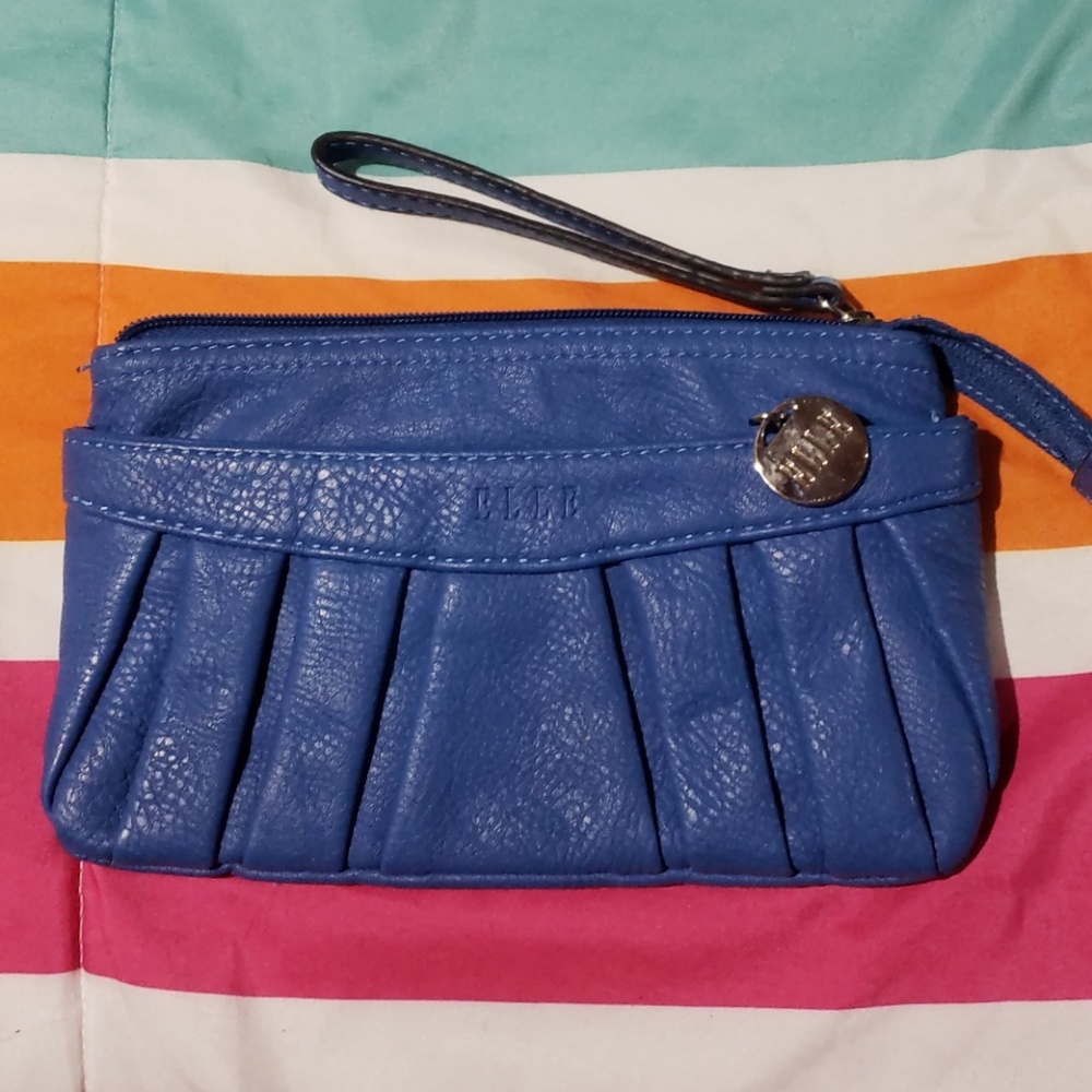 Blue wristlet. Does have a little wear on the inside on one of the card slots but that's it. Otherwise absolutely no rips or stains. All zippers work. Silver hardware.