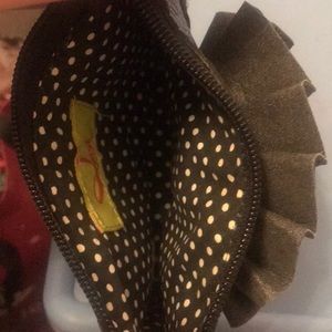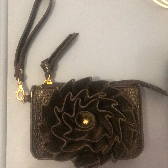 Never been used bought at a boutique for my daughter and she’s still too little to use!!! It’s an adorable pebble leather wristlet with a floral leather appliqué and gold hardware with a polka dot interior