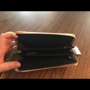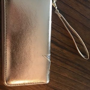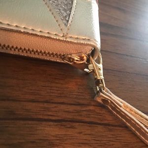Cute printed wallet with a removable wristlet strap. Features interior and exterior zippered pockets and plenty of space for cards and cash.