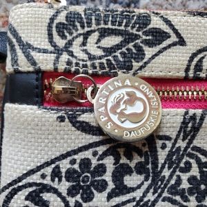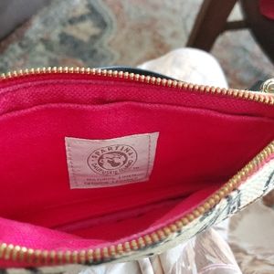 Spatina cream and black wristlet with red details and zippered front pocket.