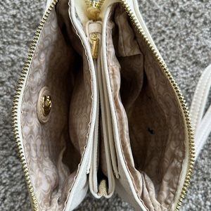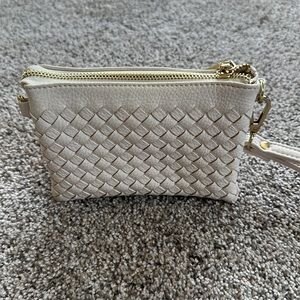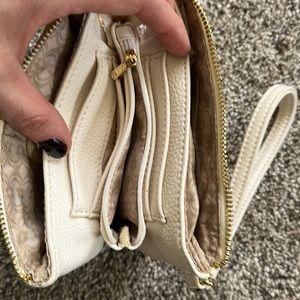 This cream/off white colored wristlet would accompany any style. It has a detachable wristband, 2 side pockets and then in between the pockets a place for credit cards and a zipper pouch for coins or cash.
