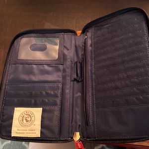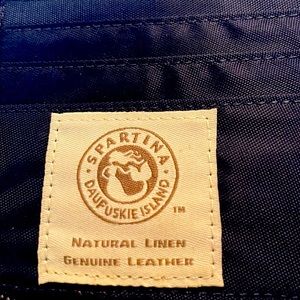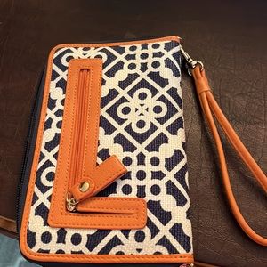 Cute wallet/wristlet in navy/cream with brown trim. Holds credit cards, pen, money.