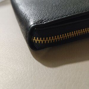 The Kate Spade New York zip-around wristlet wallet features a sleek black leather exterior with gold-tone hardware, offering both style and function. Multiple compartments inside provide organized storage for cards and funds, while the wrist strap ensures easy carrying. A must-have for those seeking luxury and practicality in a compact form.