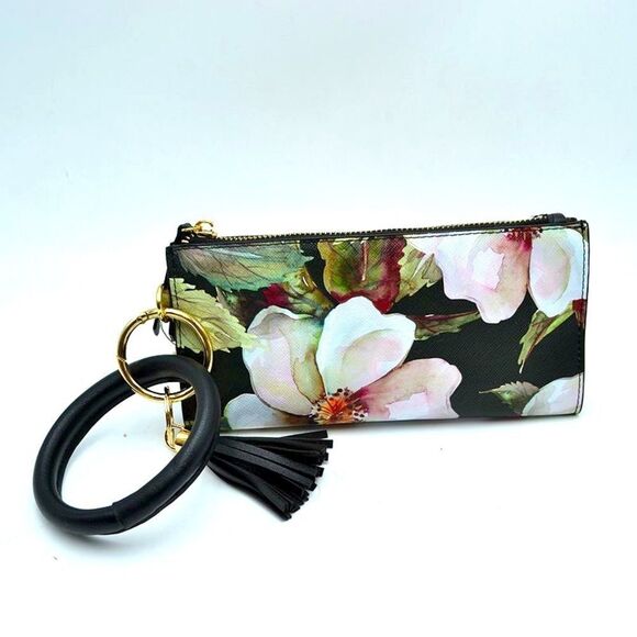 This wristlet comes with an awesome arm key holder for your keys. It has a zipper top closure with an open pocket on the inside.