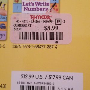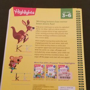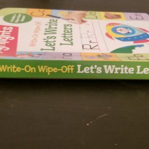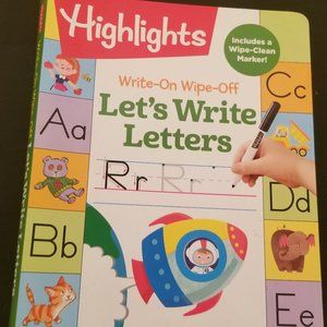 Write-on Wipe-off, Lets Write Letters, by Highlights. Measures 11"X 9". You use a erasable marker to write in book and use a rag to erase. Recommended age is 3-6. Great learning book.