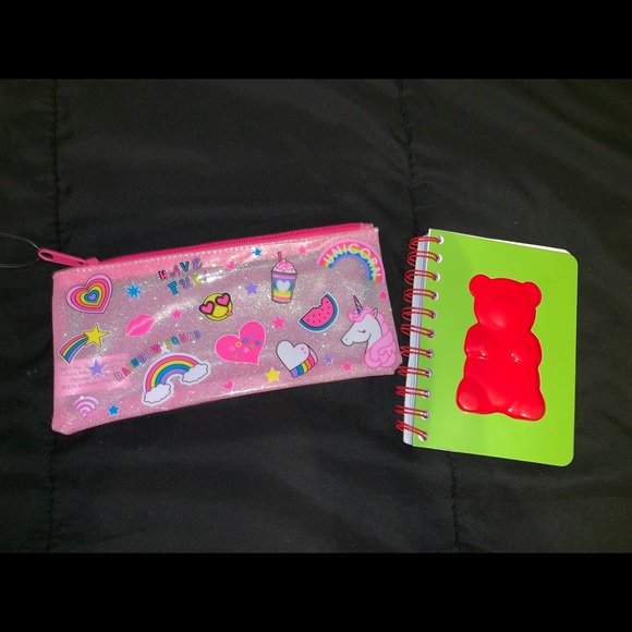 Comes with a little gummy bear note pad, and a unicorn pencil case! All brand new, never used