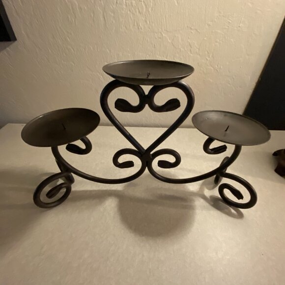 Add timeless charm to your space with this beautifully crafted wrought iron candleholder. The elegant scroll and heart design holds three pillar candles, creating a warm, romantic glow perfect for any setting — from farmhouse to modern rustic.