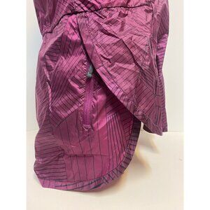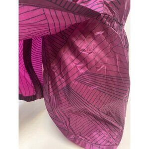 Brooks brand Run Happy running/jogging lightweight Wind Layer/jacket in burgundy color with geometric strips. Medium size. Long sleeve, elastic at wrists, full zip, hidden zip pocket, longer jacket with overlapping flaps from back of jacket to front to allow for active movement similar to running shorts style. See pics.