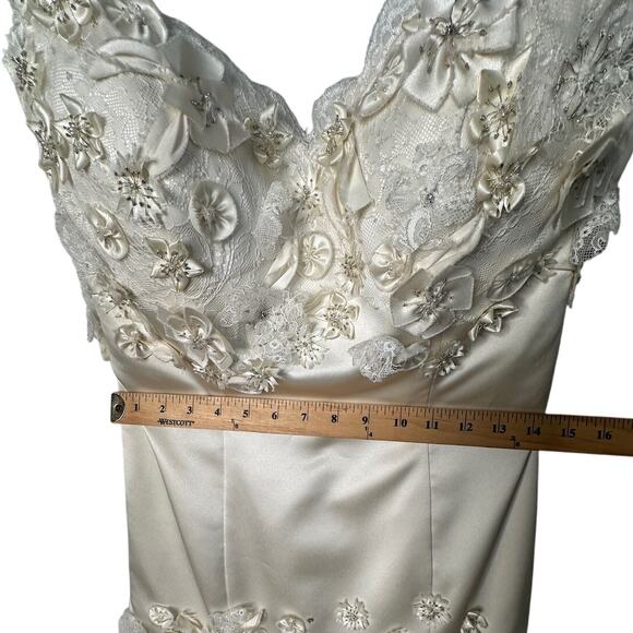 Ivory soft satin and lace beaded flower embellished, key-hole gown with fitted body and trumpet skirt. Satin covered buttons to end of bodice with a sweeping train.