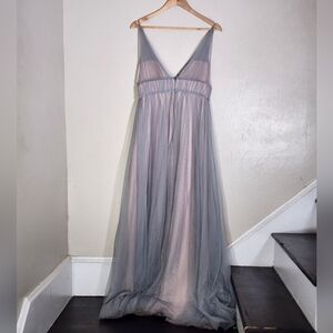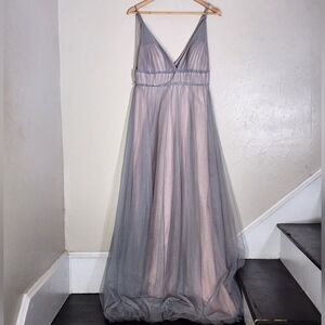 This stunning evening gown features a beautiful blend of gray and pink hues, perfect for any special occasion. Its elegant design ensures you stand out with grace and style.