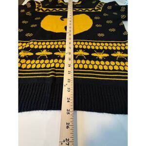 Wu-Tang Clan graphic knit sweater in bold black and yellow. Features the iconic Wu logo front and center with honeycomb + bee design throughout. Medium-weight knit, perfect for layering, concerts, or festival fits.