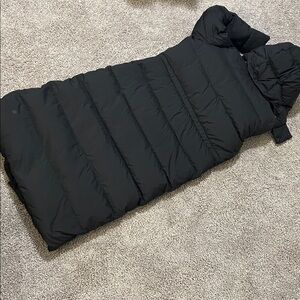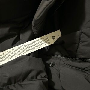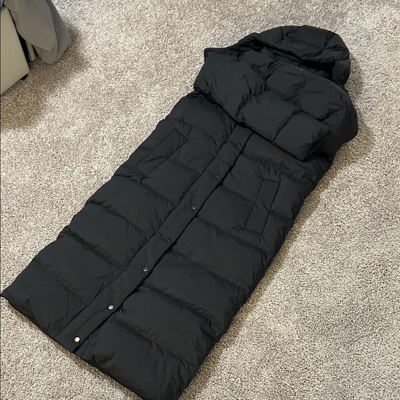 Sleek long puffer with attached hood. Snap-front closure and horizontal quilting. Lightweight insulated design. Minimal, versatile black finish. Brand new