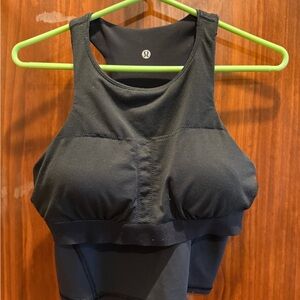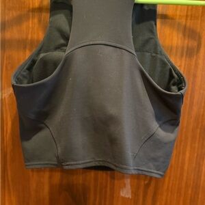 Sleek black cropped high-neck tank. Smooth stretch fabric for workouts and athleisure. Minimal seamless design. Versatile for studio or casual wear. Comes with breast pads.