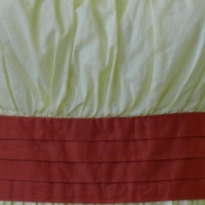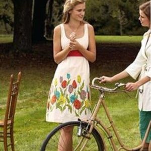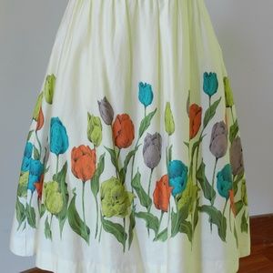 Sweet and fresh in buttery yellow with printed flowers. Well-tended tulip bulbs pal around on creamy cotton sateen, conspiring to help you look stunning at your next garden party. Poppy red waist. Size 4. Approx 18" bust, 14.25" waist, 37" length.
