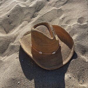 100% Raffia Crochet Cowboy with a bead and seashell trim. Metal wire brim that is shapeable.