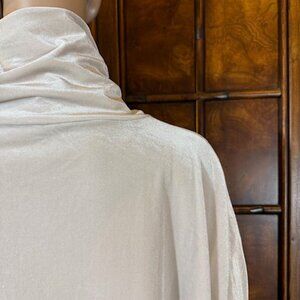 This lovely cushy velvety soft top is a definite gem. Her sophisticated turtleneck, exquisite sheen, bracelet length sleeves, sexy side slits, and exquisitely chic creamy hue are quintessential chic elements.