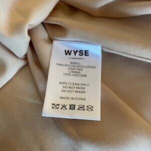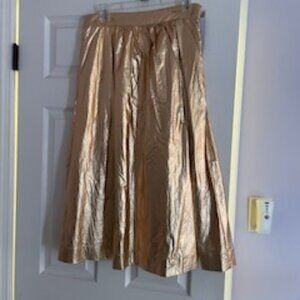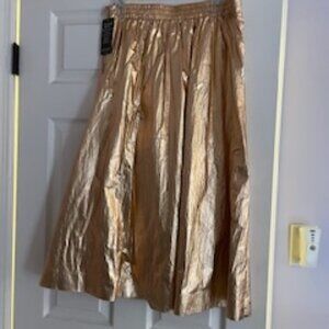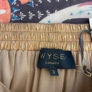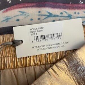 Wyse London flowy metallic skirt in rose gold. Size 3 in Wyse styliing. Size 3 measurements are waist 30.7" and length is 32.6". Size 3 translates to size 12 UK and US 8. Waist has side zipper and elasticized waistband in back. Fully lined. New with tags. Excellent condition and perfect for dress down or dress up. Pockets on both sides. Skirt is nylon with viscose lining.