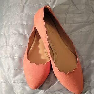 X APPEAL WOMEN"S FAUX SUEDE AMANDA FLATS-PEWTER SHOE CONSTRUCTION WITH SCALLOPED DETAILS FOR FASHIONABLE APPEARANCE SIZE 71/2 COLOR ORANGE COMFORTABLE &RELAXED WHILE O YOUR FEET AS CUSHIONED FOOTBED LENDS SUPPORT THIS ITEMS IS PRE-OWNED EXCELLENT CONDITION WITH ONLY LIGHT SIGNS OF WEAR IF ANY CHECK THE PICTURES