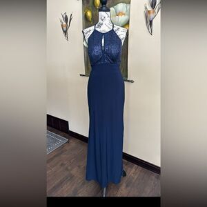 X ByXScape navy blue with sequins halter top gown openback high slit on side sz4