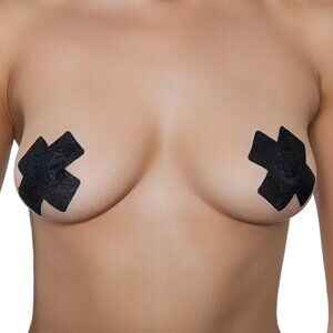 Self adhesive seamless cross shaped lace nipple covers. Disposable, single use. 3 pair per package, 6 pieces total. Measure about 3" across. Black. New in package. 100% Polyester. Great for dance, rave, festival or club outfits, Halloween costumes, dress up, parties, sexy bedroom outfits and more!