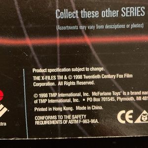 Product by Twentieth Century Fox Films. This item comes from a Smoke free and Pet free home. I price my items fair to start with. This particular X-Files Figures is selling from $20.00 up to $$88.00 online according to condition of the package.