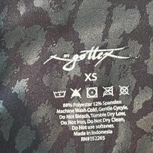 Gottex high rise leggings in cute leopard embossed black print. 2 side pockets. Flattering seams and wide waist band. 24 inch inseam length. Worn once - in excellent like new condition - no flaws. Size XS. These are so cute not only to wear to the gym but also out and about. Dress them down with runners or dress them up with stillettos or boots! Very flattering cut.
