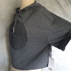 NWT A Sporty Lightweight Hoodie Sweatshirt with a Rolled Short Sleeve Cuff. This High-Low Active Dark Grey Top has a Black Logo Screen Print Circle Design in Front.