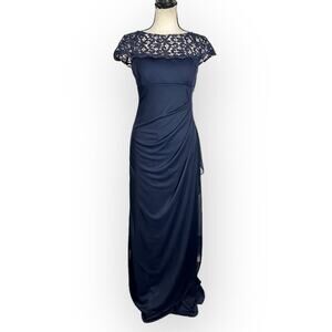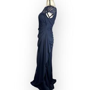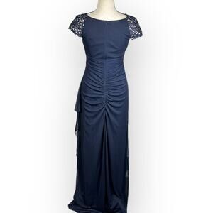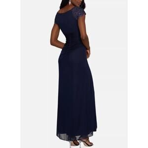 X by XSCAPE Embellished-Neck Gown Women's 4 Navy Blue Maxi Cap Sleeve NWT