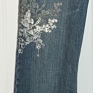X2 Denim NWOT Flare Jeans With Distressing Foil And Stone Design Size 4 Regular