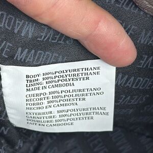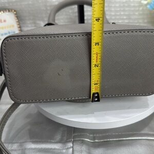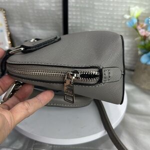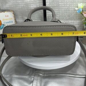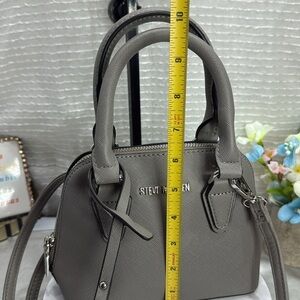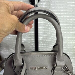 (X2) MINI STEVE MADDEN BFAITH CROSSBODY BAG, used with a defect on the bottom, in good condition. See photo for more details. Stylish Steve Madden satchel in charcoal. Features dual handles and detachable strap. Ideal for versatile use.