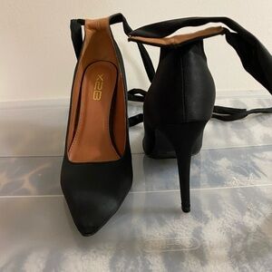 Black satin; pointed toe; wrap around ankle tie; 4” heel Worn only once