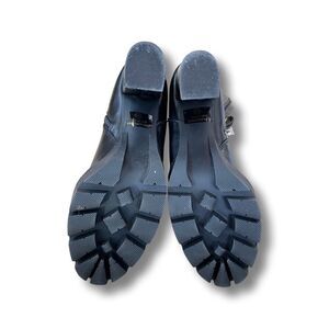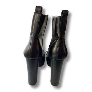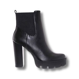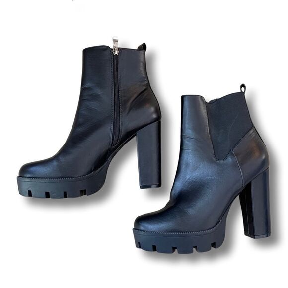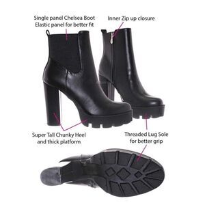We took a classic Chelsea Boot silhouette and traded the inner elastic panel for a zip up closure. The boots features an ultra high chunky block heel and a thick platform with threaded lug sole. The high ankle shaft in vegan friendly faux leather upper is soften by the one sided elastic panel.