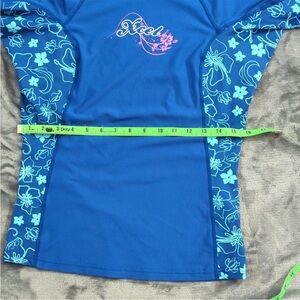 PRICE FIRM🔒 EXCELLENT CONDITION, LIKE NEW. Sporty, preppy short sleeve rashguard in vibrant royal blue with aqua turquoise tropical floral print down the sides & underarms. Brand XCEL in yellow with pink hibiscus 🌺 flower design on front. Made in Thailand🪷designed in Hawaii 🌋 Paddle board, kayaking, boogie boarding, swimming, surfing & beach. Measurements in photos.
