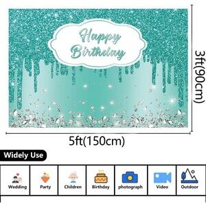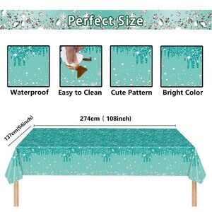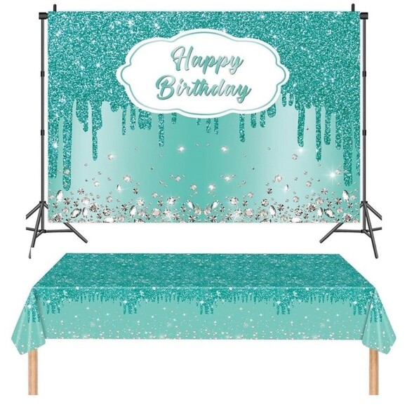 XCKALI Teal Blue Birthday Backdrop and Tablecloth Kit Glitter Teal Blue Diamond