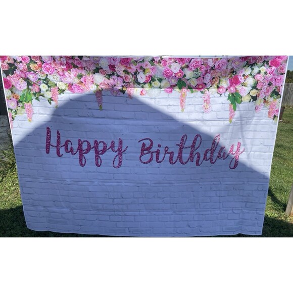 XCKALI White Brick Wall Floral Happy Birthday Backdrop 7x5ft