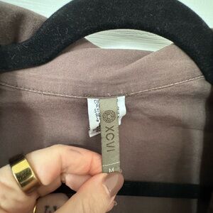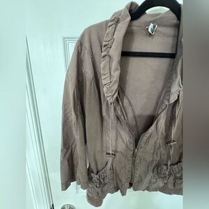 Chic XCVI utility jacket in taupe. Features ruffle accents and front pockets. Ideal for casual wear.