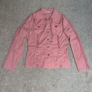 XCVI Wearables Raw Edge Poplin Lightweight Safari Jacket Bellini Pink Small. Style 1267W. This poplin jacket features details such as a button front closure with raw edge collar, cuffs and hem. But we added style lines with grossgrain, inseam four front patch pockets, and grossgrain inserts on back for an impeccable fit. Lightweight. Stretch Poplin - 96% Cotton and 4% Spandex. Approx measurements: 18“ pit to pit & 23“ length. Great pre-owned condition. No stains/flaws. Smoke/pet free home. Offers welcome. Bundle & save. Ship same/next day. Packaged w/ care.