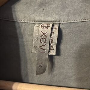 Army green zip jacket from XCVI. Crochet patch pockets. 3/4 sleeves. Size large.