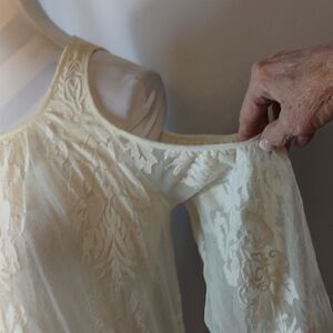 This cream colored floral lace XCVI cold shoulder top is a size Medium with a pit to pit measuring 21". It has statement flared sleeves. Self: 65% cotton 45% nylon, Contrast: 100% cotton and machine washable. Pre-owned and in excellent condition. All offers are welcome.