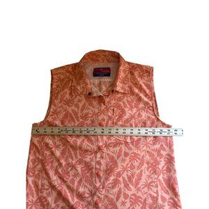 Sleeveless, snap front top from XCaster Outdoor, ideal for outdoor activities. Decorated with a unique salmon colored leaf print, it offers UPF protection. In great condition.