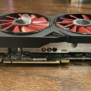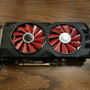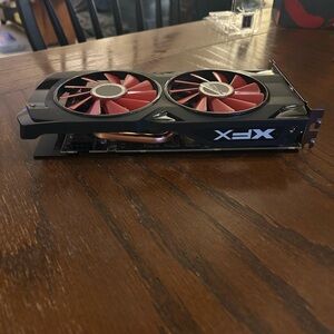 Powerful XFX graphics card with dual red fans. Sleek black casing. Ideal for gaming and high-performance tasks.