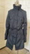 Cool, sleek, contemporary, modern pinstripes on a casual utility longline trench rain coat. Black with gray pinstripes. Lightweight fabric, fully lined. Collar can be worn down, popped up or buttoned up, mock neck muff style. Long sleeves with tab and button detail on shoulders. Button flap pockets on either side of chest, large pockets at either hip with affective drawstring detail. Jacket zips and or snaps down the entire front. Concealed inner drawstring to cinch at waist from inside the coat. Excellent condition.