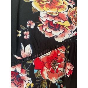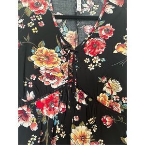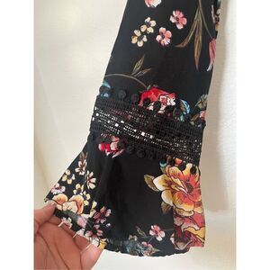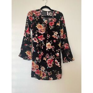 XHILARATION FLORAL PRINT DEEP V-NECK LONG BELL SLEEVE LACE TRIM MINI DRESS