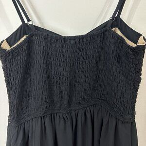 Solid black fit & flare dress with sheer floral lace front bodice and a semi-sheer skirt overlay. Adjustable spaghetti straps and built-in bra. The bodice is stretchy; the skirt is not. Tan lining is visible through the lace. Dress is in nice preowned condition.