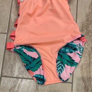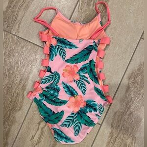 XHILARATION One Piece Swimsuit, Palm & Hibiscus Print, Size S/P, EUC. Strappy cutout sides, adjustable straps, lightly padded cups, banded shelf bra.