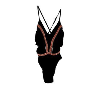 Gorgeous Black One piece with Beautiful Embroidery on Front, open Back with Ties, Cut out in front